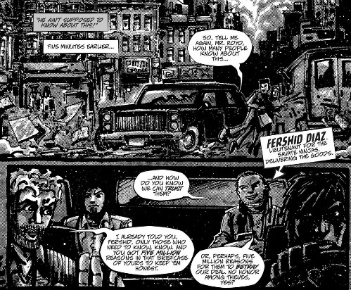 Shelby: I’m a little more lukewarm on this issue than you are, Taylor. This is indeed my first foray into the TMNT universe, and mostly I found it both hard to follow and overly simplistic. The art was a big sticking point for me; with the lack of color and chunky, high contrast style, I really had a hard time following the action. Telling a heist story with multiple players all zeroing in on one point is a hard story to tell in this medium; the only way to show the overlapping action and missed connections necessary is by employing a series of short flashbacks and repeated actions. “Five minutes earlier” gets real old, real fast, and while I can appreciate the ambition behind taking on this story, I think the flow was too jilted for me to get into, and the pencils too loose and messy for me to follow.