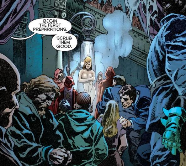 Damian lets himself be dragged to the hideout of the Saturn Club (cool name, guys) by a zombie(ish) horde. While Robin’s playing possum, Batman gets a sample of zombie blood and tests it for… stuff… Back at the hideout, the Saturn Club is just about to rip into their feast of human sacrifice when Robin springs to life and rescues all the kidnapees. Robin leads them out with an assist from Batman, who found a trace of some rare concrete mix in the blood sample he’d taken, and was therefore able to pinpoint Damian’s location.