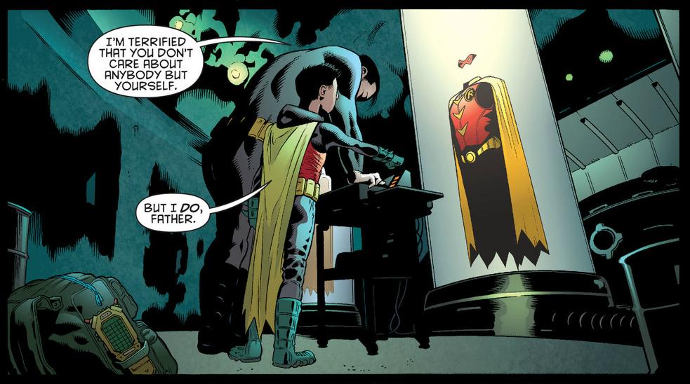 Safely back in the Batcave, Bruce lays in to Damian for ignoring him. This is a common refrain for these two, and for father/son pairs everywhere. They dance around their old argument for a little bit and then Bruce pulls out the big guns: