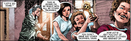 Taylor: Tell you what Shelby, while I am a man who enjoys his noir just as much as the next, I am in no way a fan of what is going on in this issue. What is perhaps an attempt to hearken back to simpler times and moments in this issue comes off as nothing but cheesy and cheap Hallmark snapshots. I’m guessing DiDio is trying to create a sympathetic character in the Stranger by having him experience these “tender moments” with his family. However, rather than making me empathize with the Stranger, these instances of familial love do nothing but further alienate me from the man and this title. I find I’m just grossed out by the overly picturesque portrayal of the perfect nuclear family because it feels so disingenuous and forced. If anyone’s family behaved in the way the Stranger’s does then I would like to hear of it because this portrayal frankly is too unbelievable to be taken seriously. I think the Stranger’s family would be more sympathetic if they were flawed and therefore real; give us a marriage that is strained, a daughter that struggles with her self image, or even a son who isn’t competing for a soccer championship. I think Anderson’s art doesn’t help this stale portrayal either. As you pointed out Shelby, it just doesn’t work for scenes of everyday life. It looks like the art you would find in a home-ec textbook from 1978.