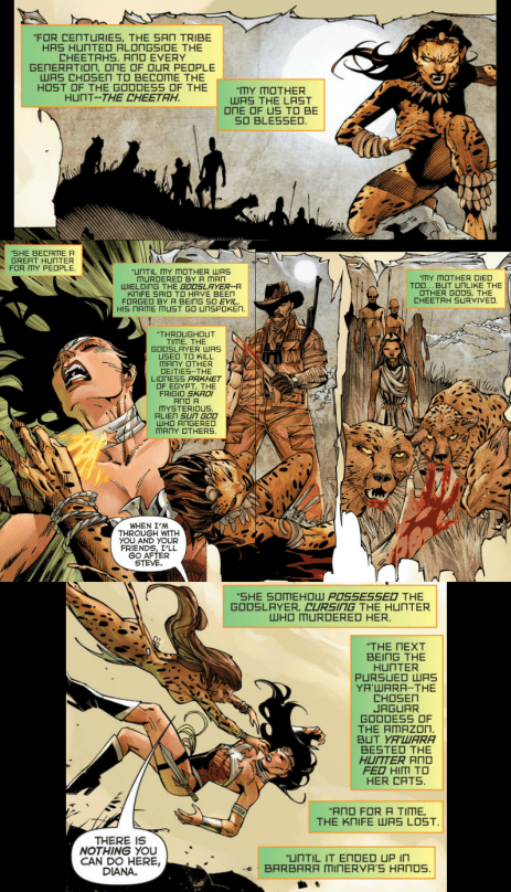 Is it just me or is this needlessly complicated? I feel like I need a flowchart to understand this thing. Seriously, I had to read this over a bunch of times before I understood what was going on. I don’t really understand why the curse had to have some kind of complicated journey to get to Minerva. Why not just simplify it and get on with the story? I imagine this convoluted set up is here because the League will use this information to stop Cheetah somehow but I would have appreciated a more streamlined explanation that didn’t require me needing to read it a couple (hundred) times.
