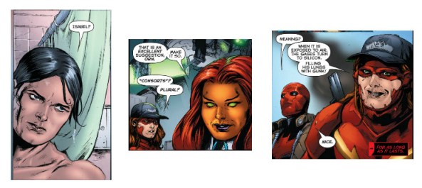 Superman comes a knockin’! On the side of Kori’s spaceship, that is; he needs to speak with the princess. Everyone thinks that’s a bad idea except Isabel, so Red Hood et al get teleported to Kori’s island home. Superman finds them immediately because duh; a fight ensues. Isabel, again the voice of reason, tells everyone to chill the fuck out and just listen to what Superman has to say. Turns out, Supes was just wondering if Kori had been approached by Helspont like he was back in the annual. Much to everyone’s surprise, she had. Superman asks her to give him a call if she hears from them again, they all give him crap for not asking for help, he gives them crap for being criminals, etc. Everyone piles into the spaceship to give Isabel a ride home, which turns out to be in Gotham. Jason sticks around for some sexy time; when he gets out of the shower he discovers Isabel has overdosed, and is dying. He freaks out, having flashbacks to his mother, and the TV starts talking to him. Not because he’s crazy, but because it’s The Joker, telling Jason the paramedics and police are already on their way. The police break down the door just as Jason tells the TV he will kill it if Isabel dies.