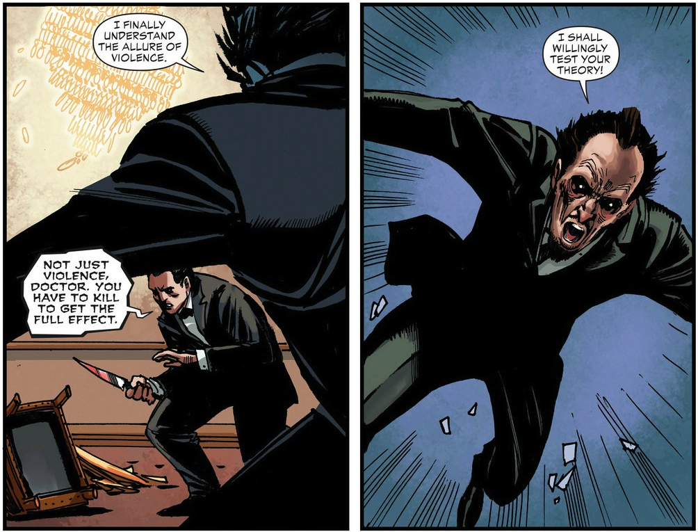 But aside from this question, this issue also asks questions about evilness itself. When Arkham drinks the Jekyll Juice he suddenly understands violence in a way he has never been able to in the abstract.