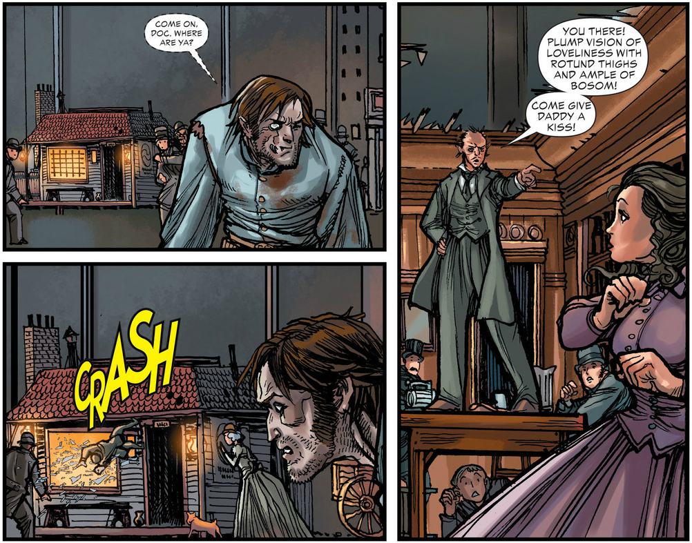 In issue 15 Dr. Arkham has found Mr. Hyde, unexpectedly, and predictably things do not go well for the good doctor. Mr. Hyde, has just eaten Reginald, and with his hunger satiated he wishes to have his curiosity satisfied as well. He gives a small dose of the Jekyll Juice to Arkham because he wants to see how the prim and proper man will act when his darker desires are put into action. However, just then Jonah bursts in seeking the money Reggie owes him for his previous services. Hyde and Jonah duel for a bit and Jonah is tossed out of a window and severely wounds his leg. Not one to give into pain, Jonah climbs back up and fights with Hyde some more before the latter is forced to retreat as the police are arriving. Meanwhile, Arkham has transformed into his “evil” self and is busy trying to persuade women to have sex with him. Jonah finds the crazed doctor and apprehends him and he is sent off to an asylum for observation. Jonah, finally gets his leg looked at and it appears he will be wheelchair-bound for at least a couple of months.