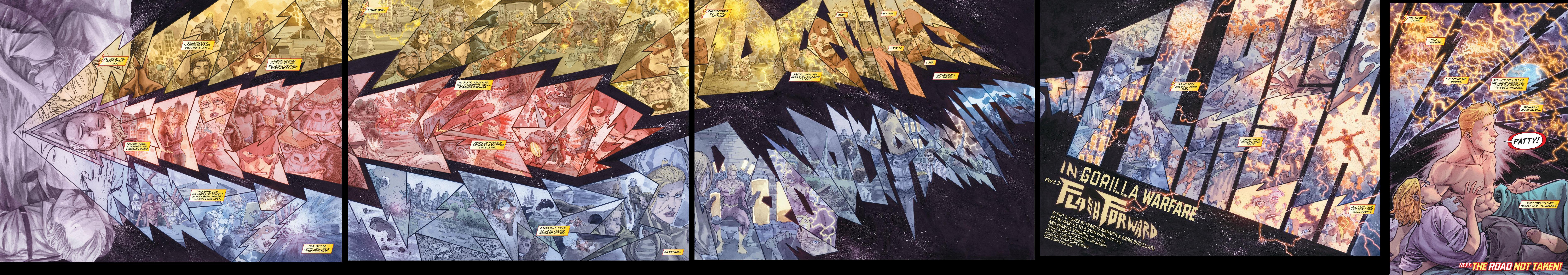 Gorilla Grodd stands over his defeated foes. That’s how the issue starts, with the villain in a position of power. Just as Grodd is about to finish off Flash and Solovar, his Speed Force power bottoms out, and he suddenly has a powerful need to get back to Elias’ lab to munch on some magical batteries. Low blood sugar, I guess. Patty gets Barry to safety (though, sorta shittily leaves Solovar to just deal with his injuries) while the Rogues whisk as many people as they can away to the Mirror World. As Barry starts to come to, the predictive powers granted to him by the Speed Force start playing out in his dreams. The realization that startles him from his coma: resisting the Gorilla army will only lead to further suffering. Barry decides to give himself up. That’s how the issue ends, with the hero giving up what’s left of his power.