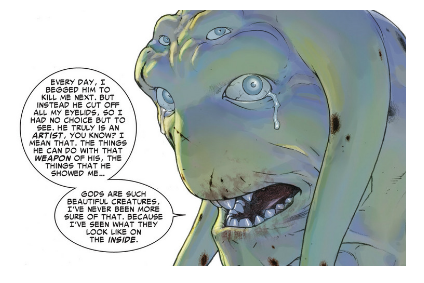 We begin with a withered, one-eyed Future-Thor in a crumbling city, begging for death and lamenting the failures of his leadership. He wants to call it a day, be done with the agonizing responsibilities and general too-much-ness of the thousands of years of his life, but dang it, the Butcher just won’t kill him yet. Jump to the present day, where Thor finds a four-eyed, no-eyelidded Shadrak in a cave. He has witnessed the torture and murder of many gods. Thor promises to protect him in exchange for information about the God Butcher.
