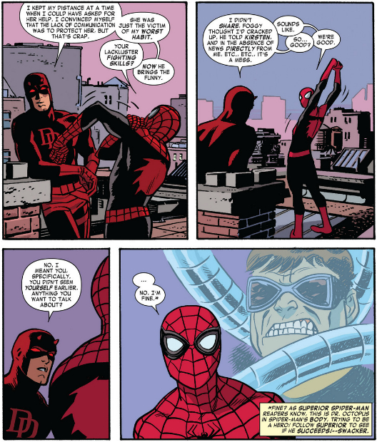 Drew: Last month, I marveled at the reveal of Otto Octavius’s Spider-Man at the end of Daredevil 21. I thought the choice of Kirsten for that first encounter was a brilliant one, since while we expect our heroes to be in the know, we’re used to civilian friends to be kind of clueless (coughJimmyOlsoncough). Of course, Marvel is playing a much longer game with Otto in the Spidey suit, so it’s a necessity that Matt not figure things out right away, either. I’m generally wary of dramatic irony that keeps the hero in the dark — it’s too often played with an obviousness that makes the heroes come off as dumb — but Mark Waid manages to find a logical, thematically resonant reason for Matt to overlook Spider-Man’s odd behavior by tying it back to his personal life.
