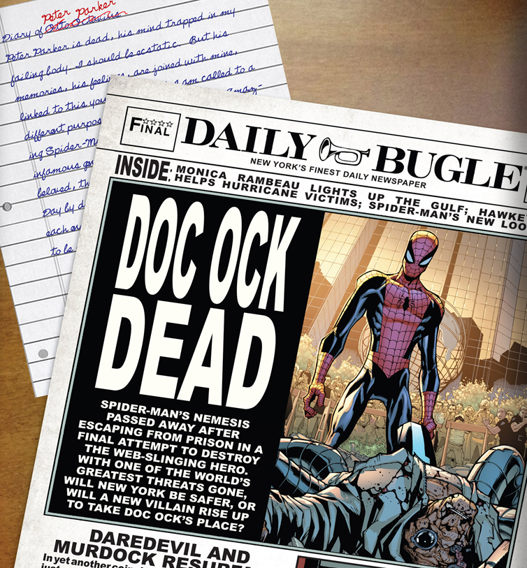 I love the Daily Bugle “previously on…” pages. I’ve gotten in the habit of skipping them, because… y’know, I know what happened in the last issue. BUT that totally made me miss that page from Peter’s diary. Hey Parker / Doc Ock – learn to type, it’s not that hard.