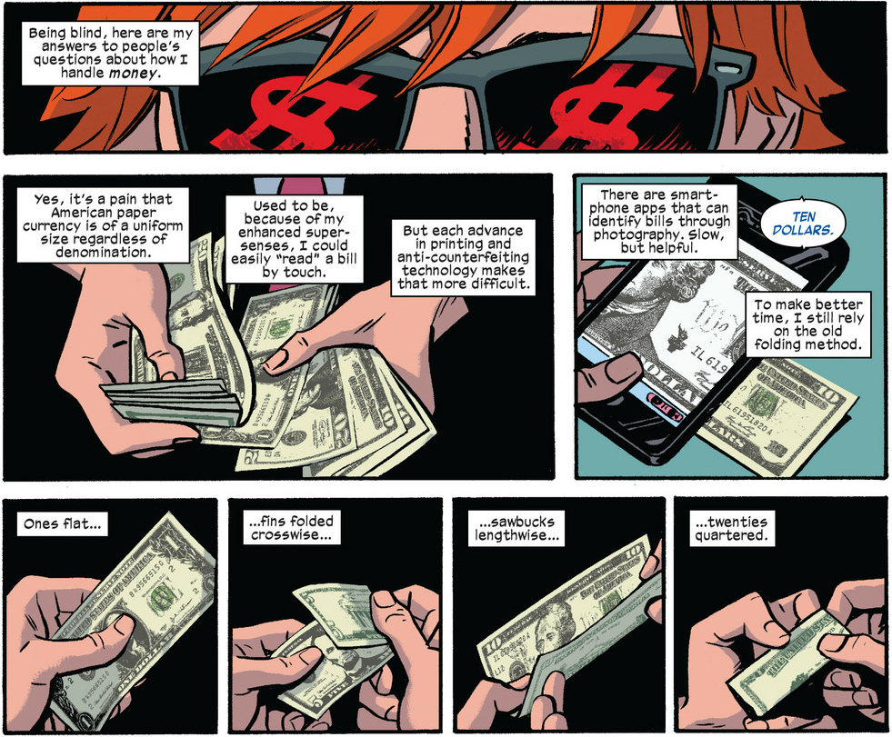 As usual, Waid creates a very immersive world, paying special attention to just how Matt experiences the world. As he’s reeling over the thought that Spider-Man would attack him, Matt runs through every defining characteristic he can: his voice, his heartbeat, his scent, his footfall, and — hilariously — his “gangly-ass posture.” Waid also finds place for these little world-building moments at the issue’s opening, as he illustrates Matt’s financial situation with a brief explanation on how the blind keep track of their money.
