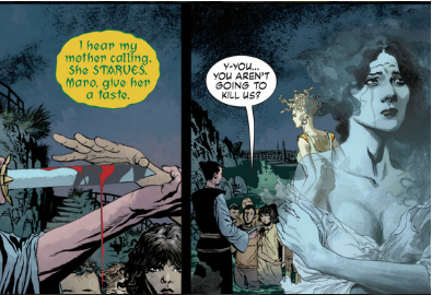 Part of what makes this issue so distinctly modern is its shifting perspective, recalling very strongly this series’ own “To Drown the World” arc. However, where that arc often felt choppy, the technique here adds an intense kineticism to a chaotic disaster scene. The issue opens with Kate and Diana arriving in Gotham, just as Croc has turned into Hydra (which Diana reminds us is THE Hydra), and as Maro has led the kidnapped children to the harbor to enact whatever plan she’s had all along. Splitting their efforts, Diana deals with the Hydra while Kate heads for the harbor for the kids. When Kate arrives (with Abbot and his were-men in tow), she’s able to convince Maria (the weeping woman) to turn on Maro, but it’s too late, the Mother of All Monsters has been summoned.