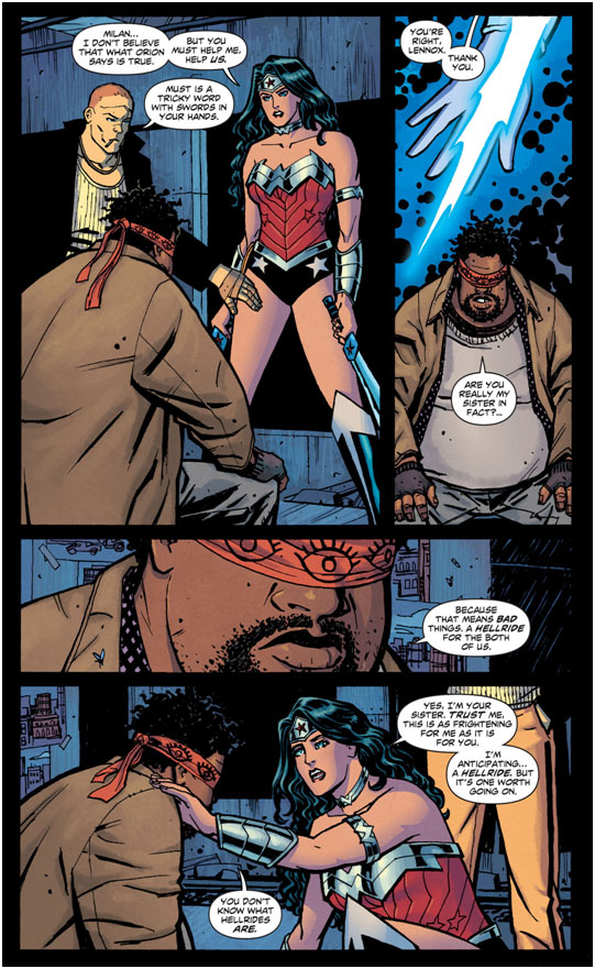 I loved getting more into Milan for this issue, but what I really want is some really epic Orion action. We’ve got friggin’ Orion in play now! Chiang’s Orion redesign has to be my outright fave redesign of the New 52. Still kind of cranky about Jim Lee being in charge of all the costumes for that