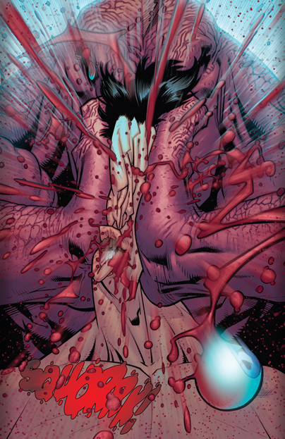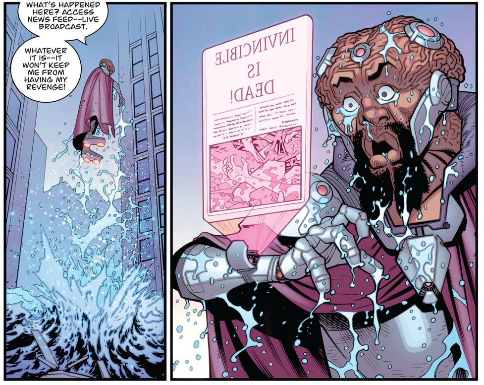 That is the head of one Richard Grayson AKA Invincible being squished by the hilariously named Dinosaurus, the one-time enemy, then ally, then expert head-squisher of Invincible. No need to be sad however as this isn’t actually Invincible, but merely a clone created by Dinosaurus in order to fool the world into thinking that Invincible had been killed. In the previous issue, Dinosaurus had flooded Earth’s major cities, killing hundreds of thousands. Invincible was indirectly responsible for the tragedy as he broke the villain out of prison in order to work with him, believing that he could use the insane dino-man’s intellect to actually help make the world a better place. Dinosaurus’ plan was to make the world think that Invincible was dead so that they could continue to work together in secret. However, Invinicble managed to convince the deranged dino that killing people was not the solution to saving the planet (go figure). That settled, Invincible was ready to be taken to jail in order to pay for his crimes. Dinosaurus knew that a more final solution was needed for himself as so asked Invincible to execute him. The deed done, Invincible walks out of Dinosaurus’ lair to meet his fate. Instead he meets Cecil (the Nick Fury of the Invincible Universe). Instead of sending Invincible to jail, he offers him a job. Invincible will work for Cecil again, much like how things worked 100 issues ago. Elsewhere, the other heroes of the world were able to set the sea level back to where it belongs and start rebuilding the cities that were destroyed. Back at home, Atom Eve is relieved to learn that Invincible didn’t actually die, and reveals that she is pregnant.