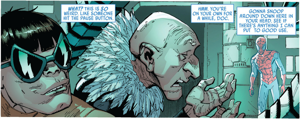 Otherwise, there were a ton of fascinating ideas here. Patrick identified several, but the one that really caught my eye was the fact that Otto kills Vulture with no interference from Peter. This wasn’t Otto overcoming Peter’s influence — Peter simply wasn’t there to guide Otto’s actions in the final battle. Patrick included the panel where Pater rejoins the action, completely confused to see the Vulture’s body, but Slott sets up his absence earlier in the issue: