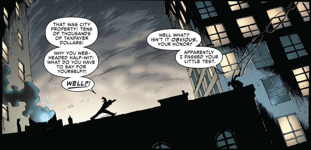 Drew: I’d like to think that it doesn’t matter if bad guys know where Batman is — he’s the goddamn Batman. I don’t really want to turn this into a discussion on the logic of the Bat-signal (though I fully intend to in the comments), but I couldn’t help but be distracted by the idea a Spider-signal. Like, it’s obviously about Batman. It felt a little strained including it at all, but the dig feels especially out of place given the role the signal plays in the final fight. Otto uses the signal to blind the Vulture, but didn’t he break it on page two?