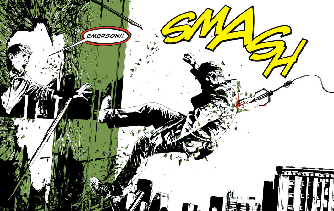 This is the only mostly black and white panel on the whole spread; the super high contrast really emphasizes the action. It’s the equivalent of a bullet-time shot in an action movie: it focuses the eye on what is happening, simultaneously slowing down the action and drawing attention to it. The green window is interesting. At first, I just took the color as a way to tie this panel to the rest on the page, keep the black and white from being TOO jarring. But then I skimmed the book again, and black and white with a green accent is kind of Sorrentino’s go-to color scheme for inset panels.