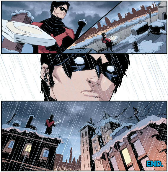 But seriously, my sympathies lie with Dick here. He’s unlucky in love when we meet him, but hope comes in the form of someone who might just understand the rigors of his job. Then those hopes are dashed when she doesn’t show up. Again, this feels like a surprisingly down note, made all the sadder by the emphatic (and otherwise unnecessary) full-stop after “END.” Jack, did you get any more out of this than Sad Nightwing?
