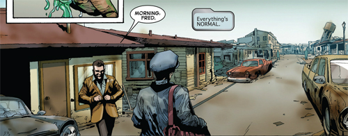 Banner’s neighbors are revealed to be dummies with faces of flaking paint; the kite being “flown” by a little boy lies decaying in the dust. If you’ve ever played a game in the Fallout franchise, the setting is strongly familiar of that post-apocalyptic world. Like Banner himself, this town is not all it seems. I especially enjoyed the Jekyll/Hyde moment you mentioned, Shelby, when Banner sees his Hulk-reflection in the window. The artists are clearly having a great time digging in to the themes of duality we get with this volume.