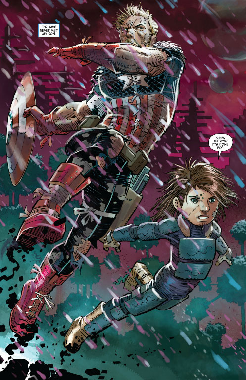 For a monthly, serialized story, eleven years between installments is a bold step. With that simple introduction, Remender has drastically raised the stakes of this story. Suddenly the full scope of what has happened to Cap is enormous; he didn’t just rescue a baby from a lab, he has raised a child. Not just a child, his child; Steve thinks of Ian as his own son. Eleven years has changed the relationship from “this is a baby, I am responsible for him” to “this is my child, I will teach him the ways of my strangely specific weapon.”