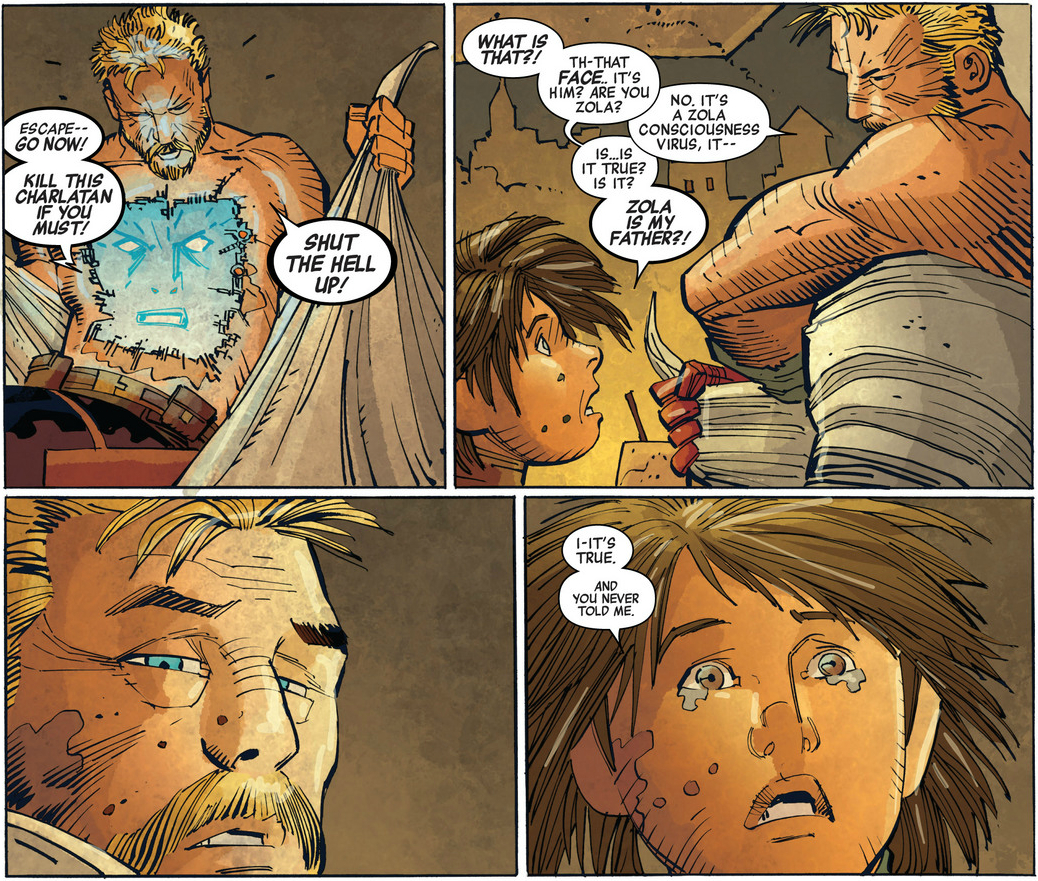 As a situation, it’s, as they say, FUBAR, but this is literally all the time we spend thinking about it. Sure, Ian is upset that Steve never told him the truth, but nobody ever again mentions that ZOLA IS GROWING OUT OF STEVE’S CHEST. Yes, yes, Zola consciousness virus, whatever — the point is: the situation is much weirder than your average secret adoption story, or even a story where someone’s father turns out to be the person they hate the most (which I’m almost certain I’ve seen in a comic before…oh, right: WATCHMEN).