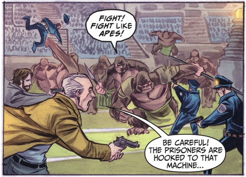 “Fight like apes!” is an easy joke, but it got a good laugh of out of me, plus it’s an effectively subtle example of the superiority complex of Grodd’s troops—of course fighting like an ape is superior to fighting like a man in their eyes (I’m not sure I disagree—they’ve sure got me outmuscled). But what I really want to point out is the police officer being flung 50 feet into the air after being punched in the gut by a gorilla in the background. I suppose that that should be tragic, but it had me in stitches.