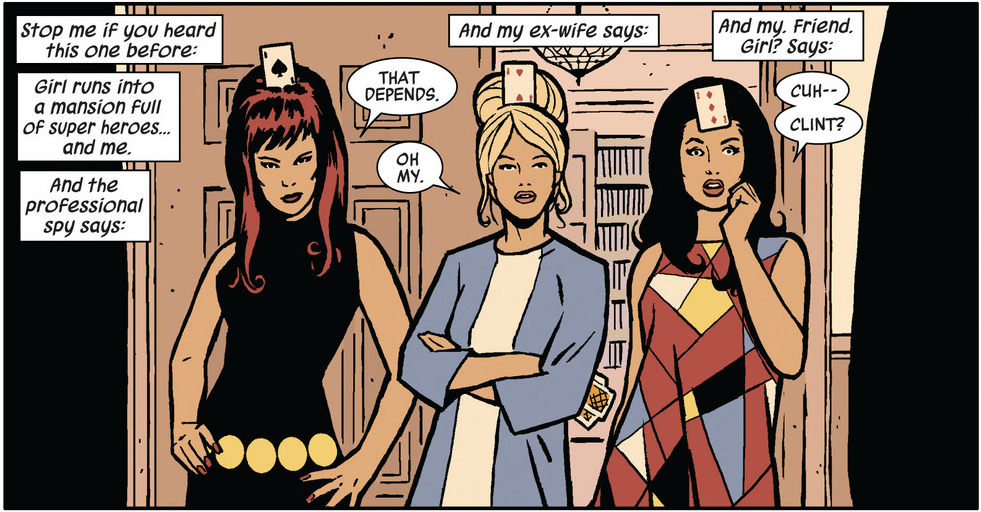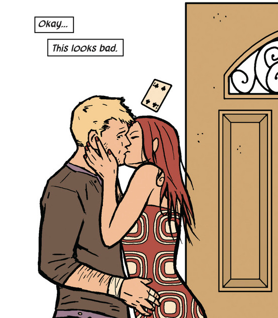 Clint Barton is not a stupid man. A stupid man would be tempted to regard this predicament as a good one:  a beautiful redhead — Penny, whom we may recall from the car heist in Issue 2 — enters out of nowhere in a short dress and high heels , kisses him passionately, and asks for a favor.
