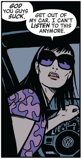 Jack: Once, in high school, I attempted to make an 800-mile cross-country road trip in secret over spring break, not because I really wanted to, exactly, but because a girl I really liked had demanded it, and at seventeen, that was enough to get me to agree to what I knew was perfectly stupid. (I was saved, incidentally, by the sage intervention of my less-stupid, less-seventeen brother, who later went on to found Retcon Punch.) I like to think we all grow out of that by the time we start making regular car payments, but this month’s Hawkeye raises some unsettling questions.