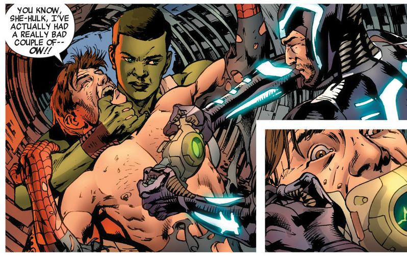 She-Hulk (is definitely not Jen Walters), Spider-man (who doesn’t appear to be Doctor Octopus) and Iron Man (he still appears to be Iron Man) Previous Next