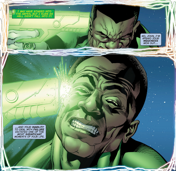 One thing I do want to defend about Mr. Stewart’s character however. I can understand why you’d find him destroying 2 planets as being redundant, but when Stewart first came on the scene he was arguably more egocentric and cocksure than Guy Gardner himself. Yes, that Guy Gardner. The destruction of Xanshi was a complete accident that resulted because John thought that he could do it all. His ego destroyed countless lives and he’s been dealing with that ever since. Destroying Mogo on the other hand was a hard decision he felt needed to be made to save the day, made even harder by the fact that he’s spent years getting over destroying another planet. My point is, for me at least, I didn’t think that him destroying 2 planets dramatically cheapened anything because it was more like reopening a partially healed wound for him.