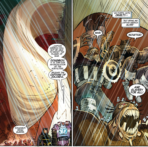 Any guesses as to what the hell a doughboy is? Me neither, but the context really doesn’t help. It’s a giant thing in the sky? Is it flying, or is it anchored somewhere? Why were the Bizarro Caps deployed via doughboy after the attack began? Why introduce an insane, obtuse concept that only appears for an instant when they could have just been there the whole time?