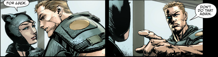 That said, I was a little confused by Steve and Ollie’s talk about Steve selling out or being a rebel (though this review helped clarify that a little), I always dislike when comics include real life politicians or stars (this will be very dated very fast), and Catwoman’s ridiculous cleavage is distracting. I didn’t mind her flirting in her characterization–I found it fun–but can she just dip the damn suit up?