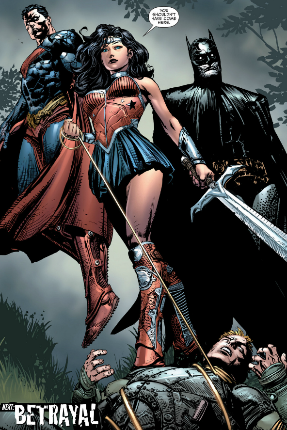 The conclusion of this issue gives us a pretty significant build up in momentum that’s bound to continue into the next issue and hopefully the rest of this arc. I’m talking about the three beings who somewhat resemble the most famous members of the Justice League. This is just a guess, but I’m going to go ahead and assume these folks are robots. It looks like Waller is getting her wish two-fold, not only does she want the JLA to be able to protect the country, but she wants them to be able to take out the Justice League as well. I can think of no better way for them to get this kind of experience than this! Speaking of the robotic Trinity, their design is probably David Finch’s greatest contribution to this issue. I really enjoy the subtle differences between his Justice League doppelgangers and the real deals. Wonder Woman’s skirt and Superman’s red underwear are wonderful callbacks to their previous looks.