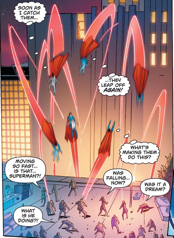 That’s not to say the issue as a whole wasn’t a bore. It gave the feeling of being too long while simultaneously progressing very little. You’re right Drew, there’s nothing more off-key than seeing Clark get hit on at a trendy night club. I appreciate Lobdell’s effort to humanize Clark in other ways, but no one’s going to sympathize with him for being too sexy. And that scene ultimately gave way to the issue’s most glaring logical flaw: if the people keep jumping off the roof, why does Superman keep putting them back up there?