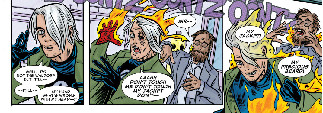 Curiously, he puts out the fire on his “precious beard” with an issue of Fantastic Four 4 (that is, Vol. 1). I initially saw that as a commentary on hipsters co-opting bits of culture with no respect for their history (which fits the anti-gentrification sentiment), but the fact that it’s issue 4, specifically, gave me pause. Leaving aside that it’s kind of odd that there is a Fantastic Four comic in the same universe where the Fantastic Four actually exist, surely the first issue would have been a more logical choice for the history of that title. Instead, we get issue 4, which is notable, among other things, for featuring the first utterance of “Flame On!”, which Johnny is also crying in that panel. It can still carry all of those commentaries, but it’s also just a clever reference to the Fantastic Four’s own history.