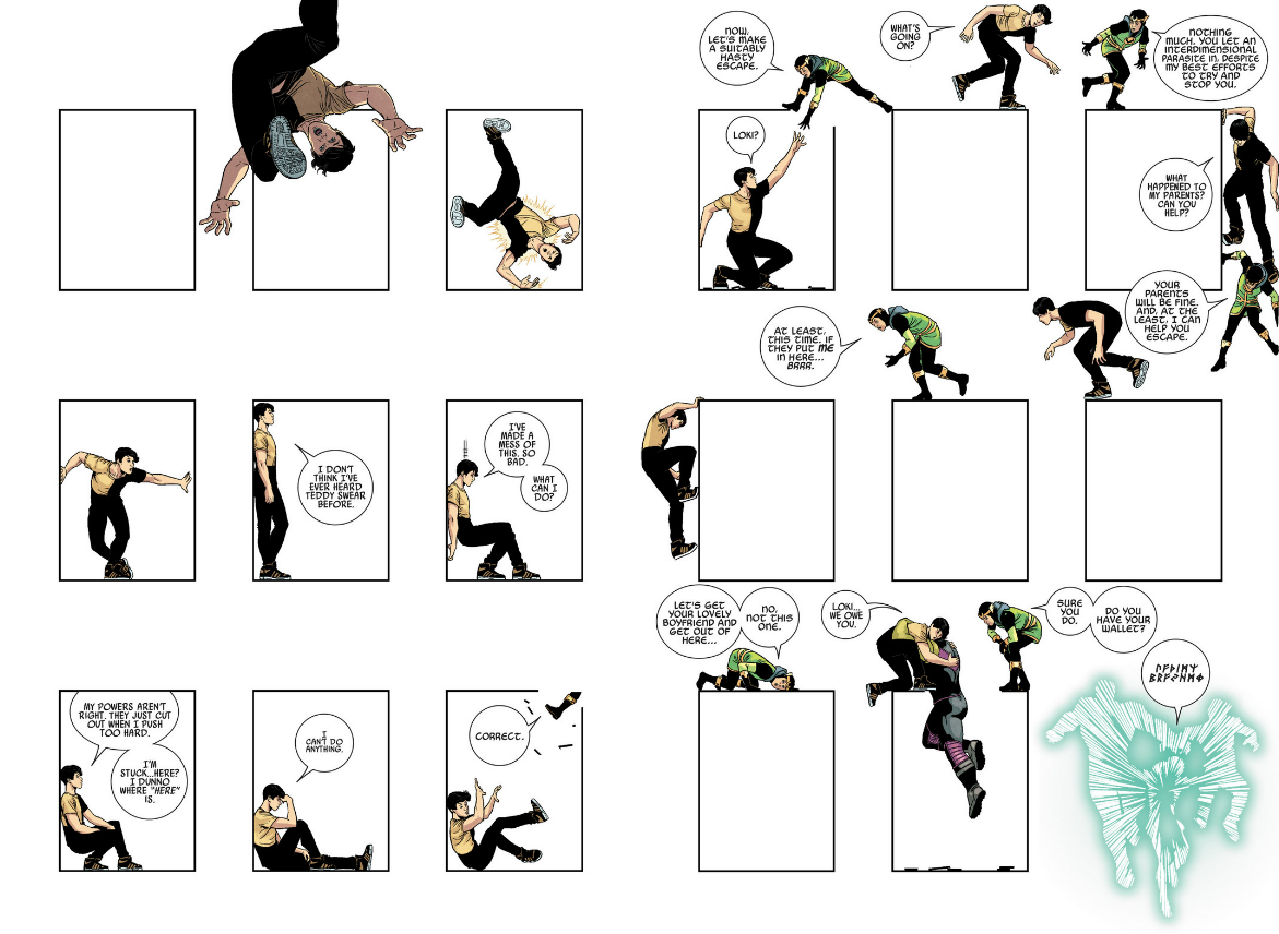 I love that spread of the boys in … wherever they are. Kid Loki and Wiccan climbing down the panel using the edge of the page to brace themselves? That’s brilliant.