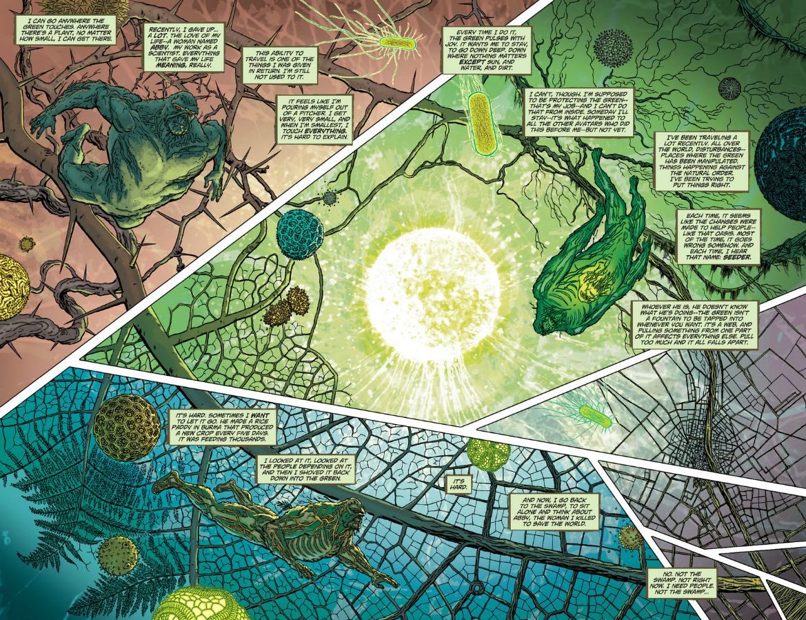 It’s possible that this is simply the Green’s reaction to fear toxin — a kind of fight or flight response — but the implication is that Alec is actively keeping the Green in check, and that knocking him out allows plants to run rampant. It’s an unexpected tack to take — I generally think of Swamp Thing as defending the environment from would-be polluters — but it’s a fascinating one. Snyder’s run hinted that the Green might be a little greedy or overly ambitious, but this issue finds the Green ready to take over entire cities at a moment’s notice. I love the idea that Alec’s main role might actually be holding the Green back from total domination — it makes the idea of maintaining balance much more dynamic.