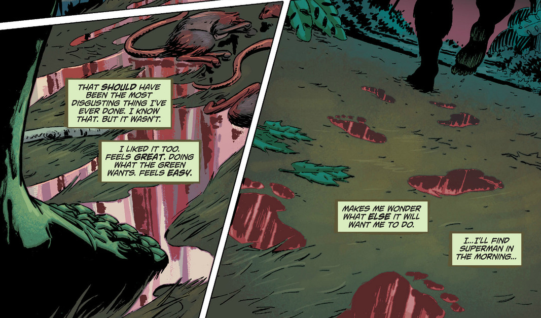 The issue finds Alec totally alone. Sure, he has all of the plants in the world to keep him company, but their interests are pretty limited. He has distracted himself from his problems by throwing himself into his work of defending the Green. Curiously, much of that defending isn’t from loggers or herbicides, but from someone called Seeder, who is making things grow where they shouldn’t. These unnatural growths are helping people, but Alec has a balance to maintain, which means he often has to chose the Green over people in need. These are hard decisions, so Alec seeks out someone who might be able to relate: Superman. Unfortunately, Alec is waylaid when he happens upon Scarecrow collecting some poisonous plants for making more fear toxin. Alec actually enjoys the opportunity to talk with another person, but Crane is simply stalling, trying an array of fear toxins until one works, knocking Alec out cold. Unfortunately, that unleashes all kinds of vegetative hell on Metropolis, which has the handy effect of getting Superman’s attention.