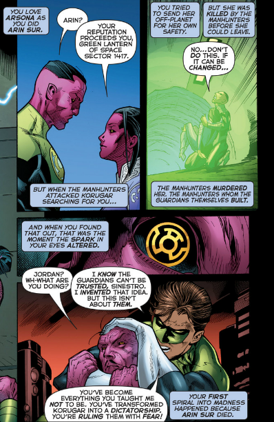 Action movies often have their hero motivated by the loss of a loved one, only to later fall in love with someone new, which has always struck me as kind of undermining the significance of that first love. Moreover, it often feels lazy, like the writers knew that loss and love were emotionally charged, so threw them together because the hero needs a love interest no matter what their history is. Johns sidesteps this a bit by showing that Sinestro never actually acted on those feelings — this is strictly a “what if?” scenario — and by openly acknowledging the manipulative nature of it. The First Lantern is being openly brazen about making things as emotional as possible, which frees up Johns to take some cheaper shots than he might attempt otherwise.
