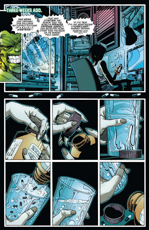 The two pieces of information I glean from this sequence are 1) that Patty is obsessed with the Hulk, and 2) she is about to kill herself. The email from Maria Hill (which presumably invited her to be on Banner’s team) stays her hand, but it’s not clear if her obsession and her suicidal tendencies are related. To that end, her intentionally baiting Bruce to Hulk-out (whoa, I’ve never used that literally before) can be read as either morbid curiosity or just plain morbid, as she attempts suicide by giant green fists.