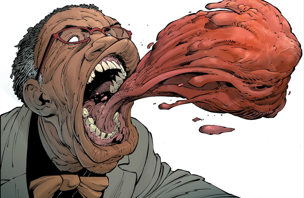 Jump to six days earlier. Bruce is shocked to learn his friend, the architect Brian Wade, committed suicide. Police files show Wade was being investigated for the murder of two of Penguin’s henchmen. Bruce goes to do some investigating at Wade’s office when he’s attacked by none other than Brian Wade, or at least a DNA match for Brian Wade. Further analysis reveals that attacker has trace amounts of the quickly deteriorating DNA of Basil Karlo, AKA Clayface. Realizing Clayface has eveolved, Bruce sees Lucius Fox about a specialized Batsuit, but lo and behold, Lucius is actually Clayface. AHH!