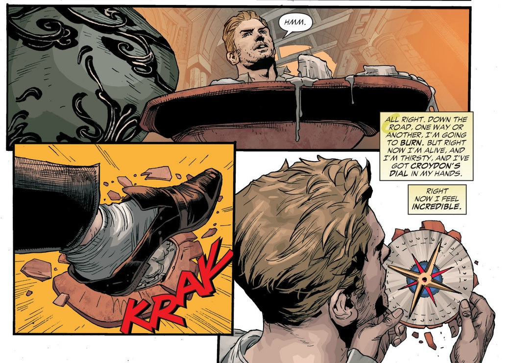 It’s interesting to see Constantine in such a confessional light. He’s admitting that magic is basically his world, even though it is the very thing that has taken away nearly everyone and everything he has cared about. This reminds me of how someone would speak about a substance addiction. He talks about how “it feels fantastic” and of the incredible rush he gets when using it or obtaining new pieces of the occult. This is a fascinating turn to the Constantine character I was not expecting. This Constantine isn’t necessarily the one who manipulates magic. Rather, he is manipulated by it. Just look at how he feels when he finally gets the dial of Croydon’s Compass in his hand.