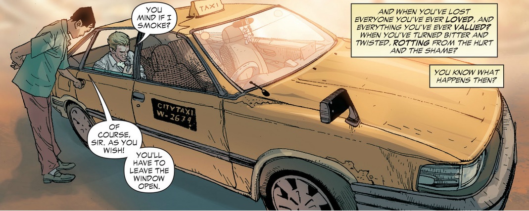 That ends up being the sticking point for the Spectre. Taylor, you’re correct: he sort of does answer to an uber-god — so uber, in fact, that I should capitalize that G. The Spectre is the living embodiment of God’s Wrath. And if he feels a little bit like the Phantom Stranger, that might be because the character is featured in a few issues of Phantom Stranger –– including his New 52 introduction in the zero issue. [This is the point in the conversation where I’d jump the defense of Phantom Stranger — since its decidedly shaking beginnings, the series has found its legs, but this is neither the time nor the place to discuss other issues (let alone other series), so I’ll just leave it at that.] The Spectre’s role in this issue is that of the audience surrogate — he passes judgment on Constantine, telling him that sacrificing Christopher was too badass, even for him. John’s response boils down to “well, do  you want to see me win or do you want to see me lose?” Is that justification enough to satiate readers that might have been alienated by John’s rash actions in issue 1? And does it matter if we buy that reasoning or not? It’s an interesting question, and Fawkes and Lemire seem content not to answer it. Readers will have to decide for themselves to what degree Constantine’s actions are moral, immoral or amoral.