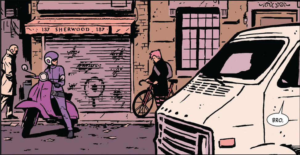 On my second read-through, I realized that bulls-eye-with-a-tear looked familiar. Clint mentioned chasing away some kids with spray paint earlier in the issue, and when Kate shows up we see the results of their fine work.