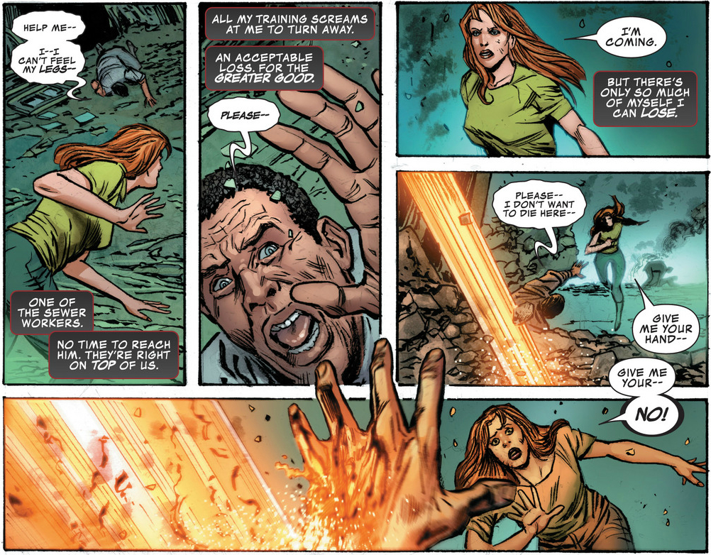 Only, I thought she already was battle-hardened. Granted, I’m still very new to this character, but my impression of her as an ex-KGB agent has always suggested that she’s ALL business. She’s cold, efficient, and above all, opportunistic. I can’t imagine this is the first time she’s had to leave the wounded behind. I mean, christ, her codename is “Black Widow” — I don’t think that’s because she was so careful about making sure everyone survived every encounter with her. I don’t mean to suggest that there’s no room to humanize her, just that her reactions seem more like those of a normal person in her situation, not those of a seasoned super-spy.