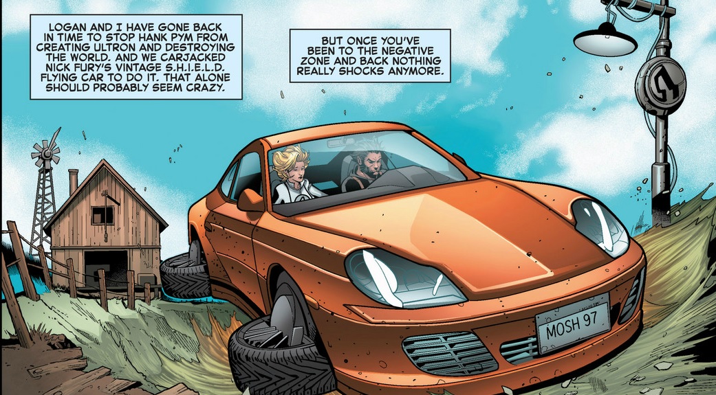 Ethan: Well, Taylor, I defintely saw a ton of really complex, nuanced things that you totally overlooked. I mean, TONS. But I can’t tell you about them because they’re, um, secret? But seriously: I think you pretty much captured the spirit of this issue in your tirade against the “expect the unexpected” platitude. In the middle of the meditation on death and decay that is the Age of Ultron arc, after watching heroes and civilians cut down by the cold unfeeling death-rays of a malicious machine intelligence, we go for a drive through rural America with Wolverine and Sue Storm in a flying car. I did not expect that; it was unexpected.