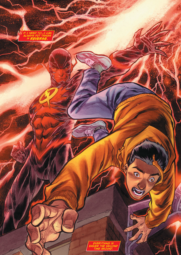 With Reverse-Flash out of the way, let’s talk about the other character featured on the above image: Albert aka Turbocharger. First of all, the name is totally silly, but in a charming kind of way. I was sad to see him dead in the penultimate page of this issue, but relieved to see his death reversed on the last. Now, I’m not sure if Reverse-Flash means to kill him again which he could easily be implying, but I’ve got my fingers crossed that he doesn’t. I think Albert has a lot of promise as a character as he’s a bit goofy and completely unsure of himself, but he’s also shown to be brave in ways that he doesn’t even realize. I think that is something a lot of readers can relate to, even without awesome tech-enhancing powers.