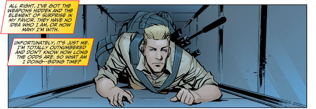 Or is it just the plot of Die Hard? Barry is trapped in Iron Heights prison without his powers (which are currently zipping around the pages of Dial H), which means it’s one regular guy forced to take on an entire gang of armed-to-the-teeth baddies on his own. Of course, these baddies aren’t German thieves posing as terrorists, they’re the Outlanders, here to spring Trickster from his sorta wrongful imprisonment (he still broke the law, but is incarcerated in relation to a murder he didn’t commit). Barry makes up for his lack of powers by collecting the Rogues’ confiscated weapons from the evidence room, taking down groups of outlanders with Weather Wizards wand and Trickster’s stun bombs. Oh, and climbing elevator shafts and crawling through the ducts.