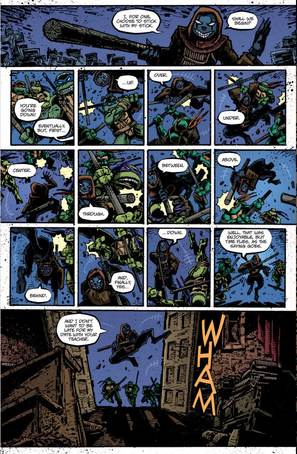 In the panel above Splinter, dressed in disguise, beats up the turtles with a volley of quick attacks, taunting them the entire time. It’s kind of a funny episode in retrospect, like maybe Splinter is tired of having to deal with four teenagers all the time, but on first read it’s quite engaging. You get a really good sense of the quickness of Splinter’s attacks due to the small and numerous panels that depict his actions. Also, you begin to realize how outclassed the turtles are at this point — twelve hits to zero is never good. Further, the page as a whole is visually pleasing, what with the twelve panels making up his attacks being bookended by rectangular panels. Overall it’s just a pleasing page to look at. And really that sums up my feelings about this issue in general — it’s just darn pleasing. I’m glad to see the turtles back in their old haunts and with it the new adventures they will embark on. It’s like coming back to a city that while dirty and dark, is still the place you call home.