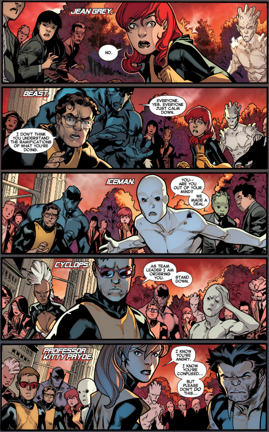 The issue begins with the conclusion of the recruitment pitch Old Evil Scott gives to the Jean Grey School — the third issue featuring that conversation, and the third to reveal that it’s Warren who decides to leave (Uncanny X-Men 4 AND 5 scooped that detail). Jean protests, mind-controlling Warren to have her way (as she did in issue 8), but the Stepford sisters are there to be creepy and powerful (as they were in UXM 4), effectively shutting her down. We then jump to a Mystique/Matermind/Sabertooth robbery (much like we saw in issue 10), and then back to the Jean Grey School for Kitty to talk Jean through her problems (much like we saw in issue 6). Hell, even the issue’s cliffhanger — the X-Men meet the Avengers — already sort of happened in issue 8.