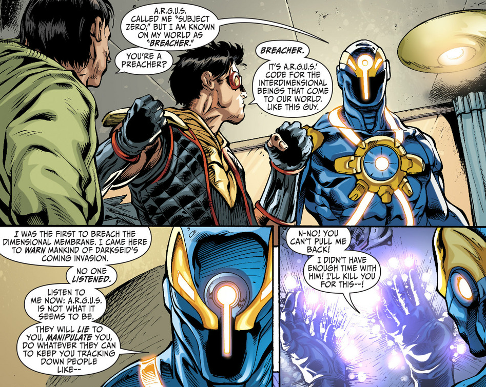 It’s kind of difficult to get behind a character like Breacher considering we know so little about him. However, what we do know is enough to perk up my ears and get me to pay attention. This dude is from some unknown parallel Earth? Cool. He tried to warn Earth about Darkseid’s attack all the way back in the beginning of the New 52? Awesome. He knows dark secrets about A.R.G.U.S. but is somehow teleported away against his own will eliciting a vow to kill someone? Yeah, I’m down. Who the hell is this guy though? Perhaps uncovering his identity could reveal even more of the secrets that this guy has stashed away, but only time will tell I suppose.