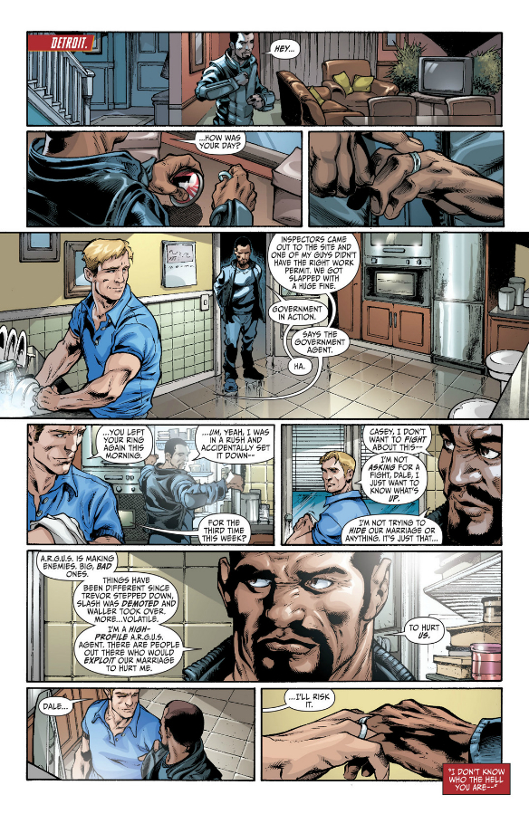 To Gates and Neves’ credit, that’s an incredibly efficient piece of storytelling. The first panel introduces Gunn and his home. The second and third reveal that he hasn’t been wearing his wedding ring (told simply by him placing it on his left ring finger). The fourth introduces Casey and their relationship. Five through seven establish the tension surrounding Gunn not wearing the ring, and the last two panels give us a resolution to that conflict. The problems is, that same efficiency makes it damn clear that this scene isn’t here for color — Gunn’s concerns about bad guys exploiting their marriage is almost certainly going to happen, and likely sooner rather than later. That sense gives this scene urgency, but it also turns it from one of character development into a bland plot-point. Unfortunately, that’s how much of the rest of this issue struck me.